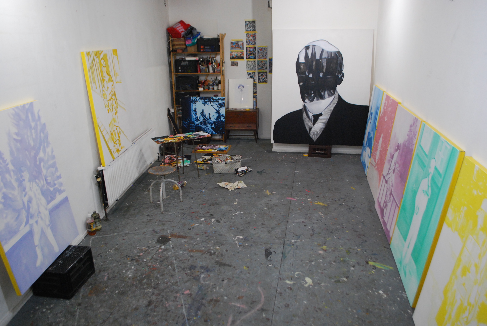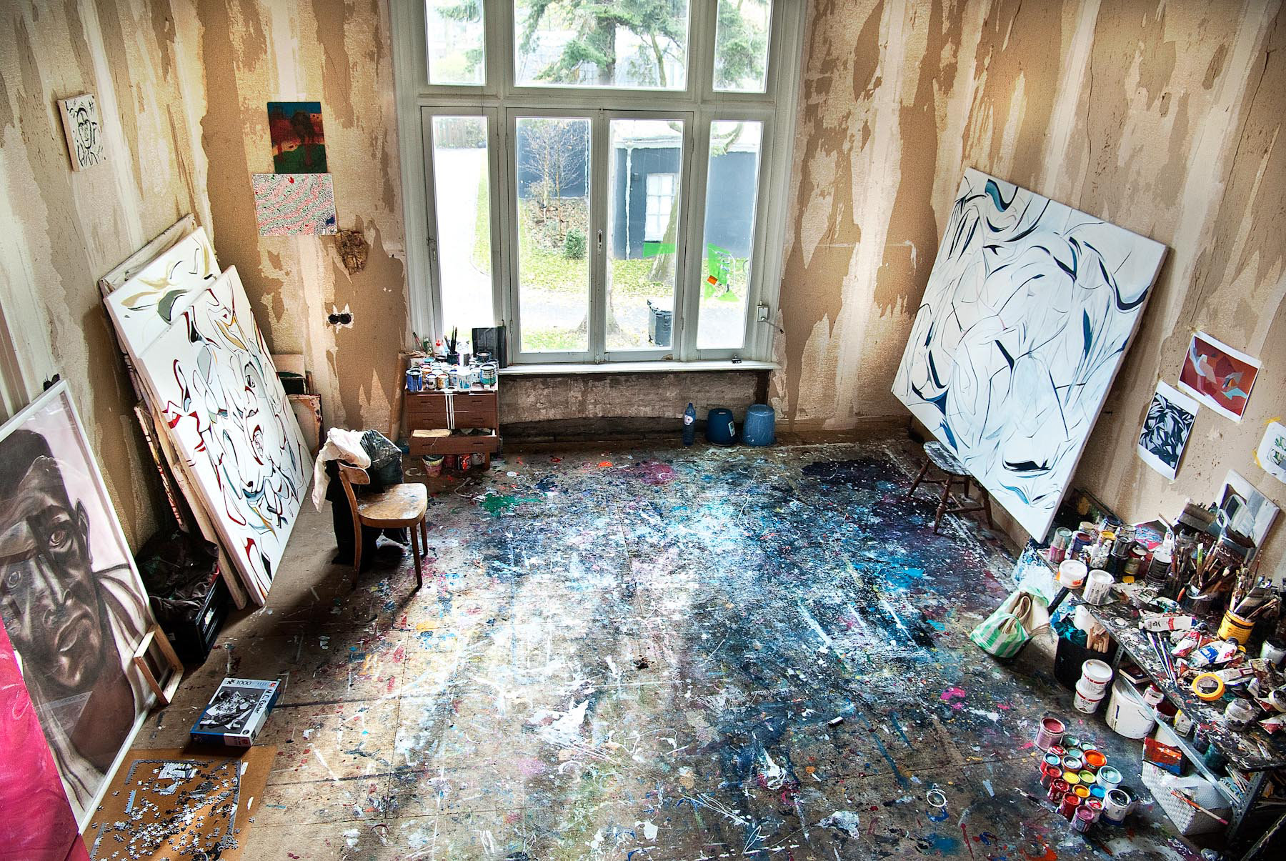 Ik werk het liefste tot laat, daardoor kom ik ‘s ochtends meestal niet voor 10.00 aan in de studio. De werkdag begint met het luisteren van podcasts terwijl ik praktische dingen doe in de studio. Opruimen, voorbereiden, iets uitrekenen, e-mails en als ik ga schilderen wissel ik vaak naar muziek. Op Spotify heb ik speciale lijsten gemaakt die ik beluister en soms wordt er ook gedanst.