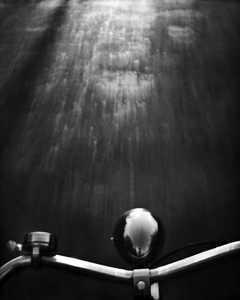 Movement also forms a crucial part of the work of the internationally renowned photographer René Groebli (*1927, CH). Groebli has over 70 years of experience as a photojournalist, advertising and autonomous photographer with many career highlights such as an exhibition at MoMA (1955), Musée de l’Elysée, Lausanne (2002), and the International Centre of Photography in New York (2023). He gained recognition at the age of 22 with ‘Rail Magic’ (1949), a series which he took on a locomotive in France and Switzerland. He skillfully captured the movement of the train's speed, the billowing steam and the passers-by in a fascinating way. Unlike the objectivity of many Swiss colleagues, Groebli aligned himself with subjective photography. Founded in the 1950s by Otto Steinert, this new movement was described as 'humanised, individualised photography'. Riding a bicycle freehanded from 1946, exhibited at Bildhalle, precisely demonstrates this personal, intuitive approach.