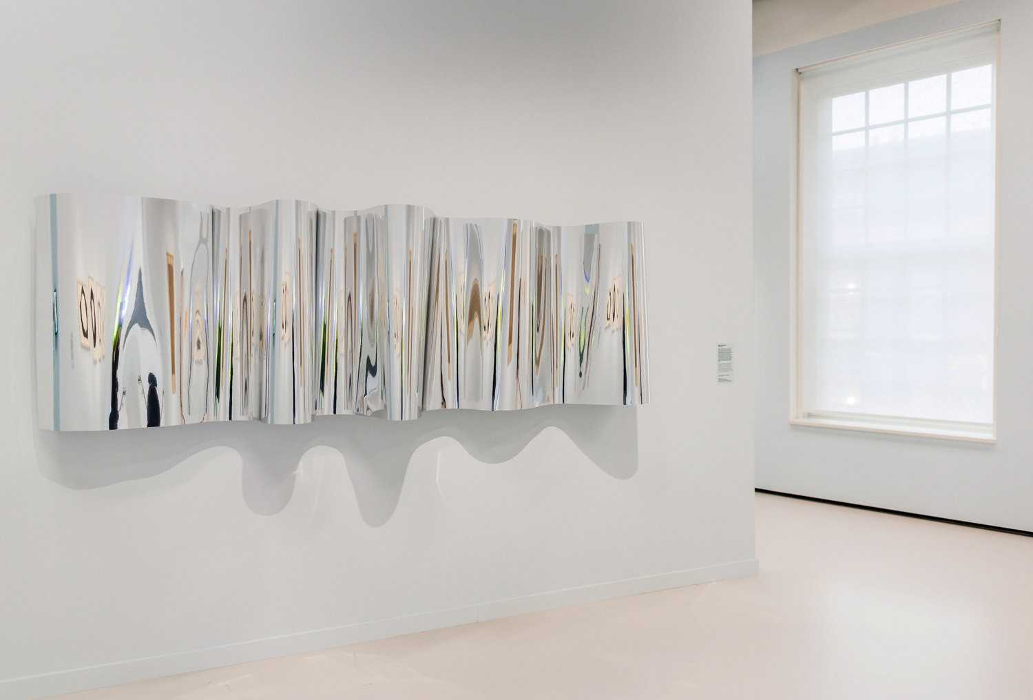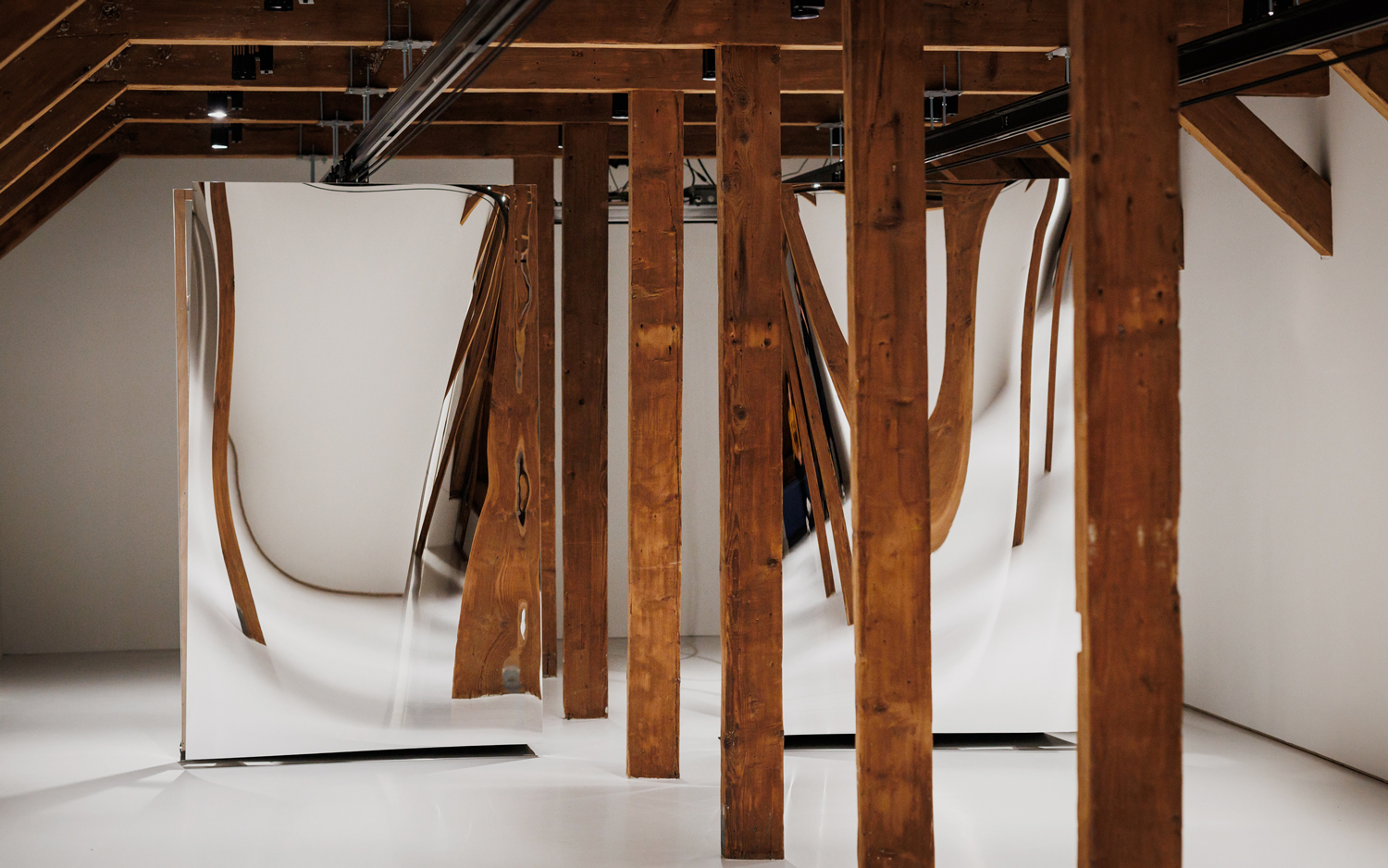 Ik werk al een tijdje met het bewegen en vooral buigen van spiegels om de reflectie te beïnvloeden. Door middel van dit werk hoop ik dat je op een andere manier kan kijken naar de omgeving waarin je je begeeft en misschien ook naar jezelf. Zaal 11 is langwerpig en ongeveer 20 meter diep. Ik heb gereageerd op die ruimte en gebruikgemaakt van die diepte.