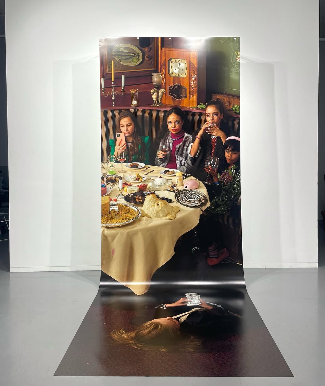 De kinderen spelen hun rollen met wrange ironie: ze lijken gehaast, dronken en unimpressed. Een kind belt furieus met een smartphone, terwijl een ander met haar hoofd op tafel lijkt te zijn in slaap gevallen. Arnell verweeft klassieke schilderkunst, soaps en christelijke symboliek, en gebruikt veelzeggende voorwerpen zoals een zandloper en een roze borstkolf om thema’s als sterfelijkheid, gender en lichaamscontrole te verkennen. De kinderen zijn overdreven powerdressed in een manier die weerspiegelt hoe kinderen denken dat volwassenen zich gedragen—met drie horloges en een veel te grote stropdas.