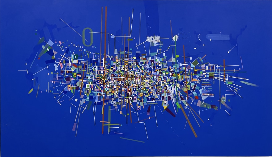In zijn eigen woorden: “Wat ik probeer te doen, is de logica van technologie aanvullen met de poëzie van het onvolmaakte.” Dit wordt voelbaar in zijn werken, waar hij vaak gebruikmaakt van restmaterialen zoals tape of verfspatten – toevallige elementen die een nieuw leven krijgen op het canvas. Dit respect voor de objecten in zijn omgeving maakt zijn werk zowel menselijk als tijdloos.