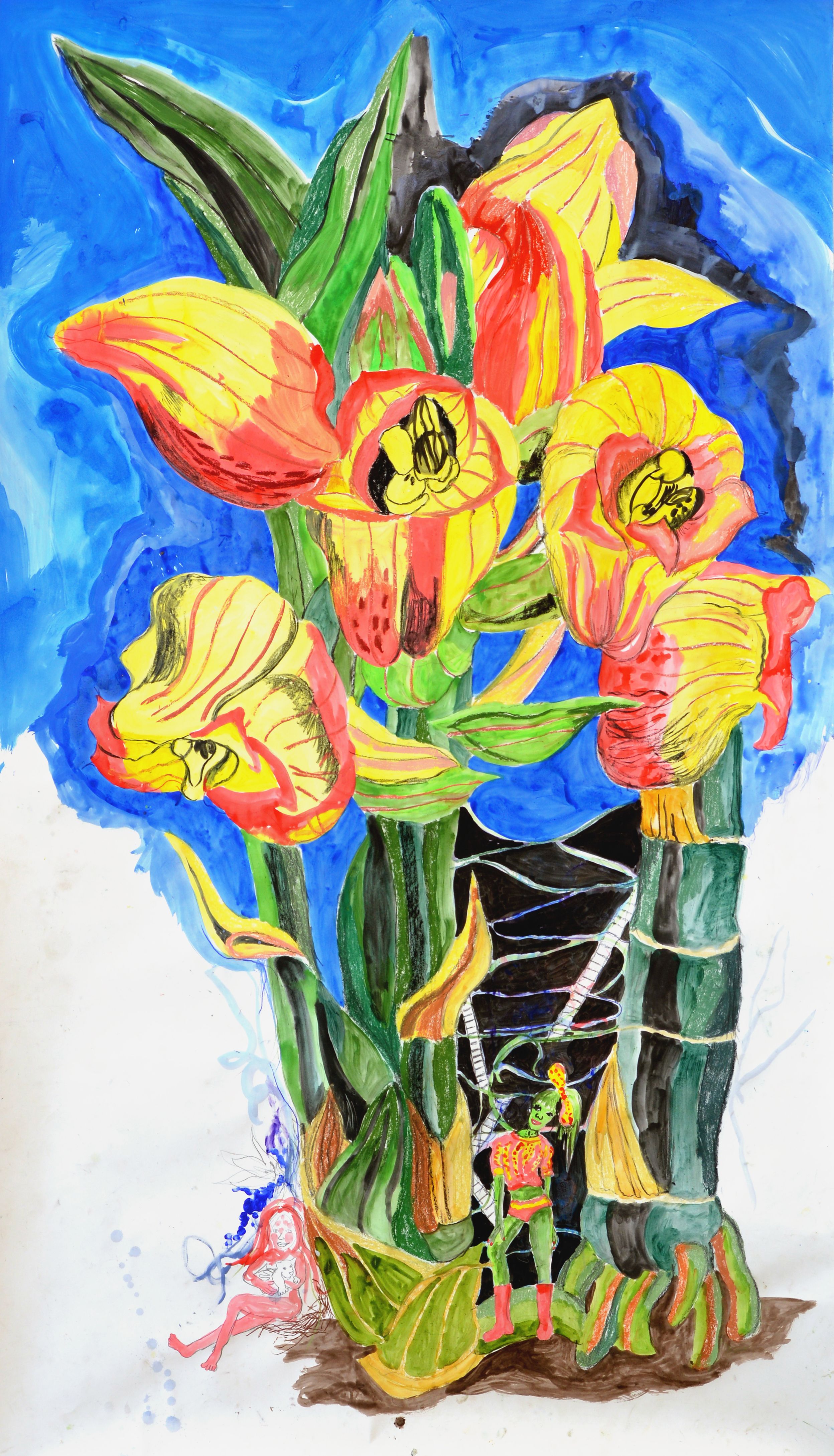 Zowel in jouw dromerige natuurtekeningen als in jouw politiek geladen schilderijen voeren vrouwenfiguren de boventoon. Naar wie verwijzen de vrouwen in jouw werk, bijvoorbeeld de vrouw die leeft in een orchidee, of de vrouw op plateaulaarzen in een bloemenjas?