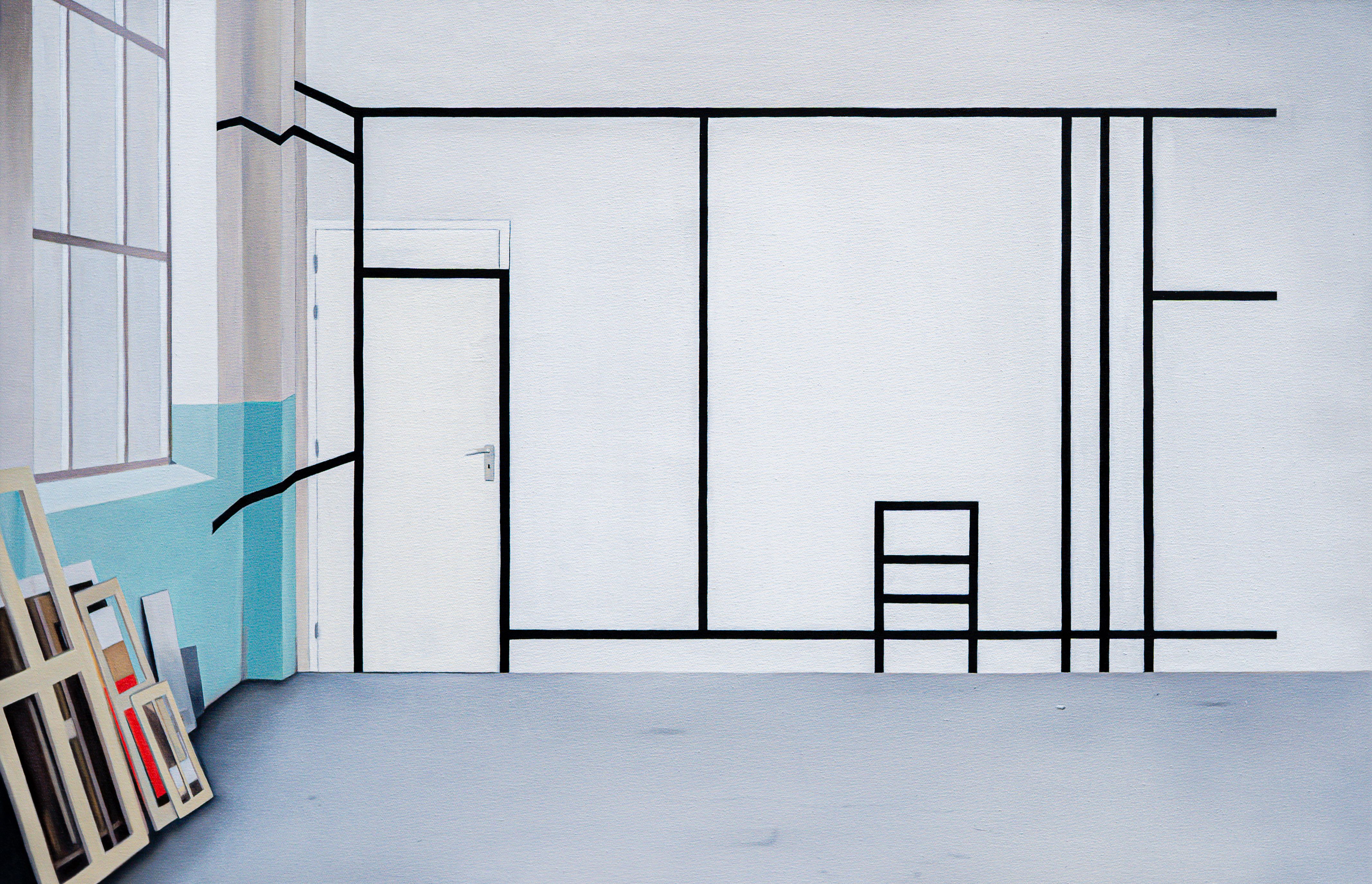 Daniela Schwabe voegt, geïnspireerd door de geometrie van Mondriaan, een abstracte en wiskundige dimensie toe aan het geheel. Schwabe’s onderzoek naar Mondriaan leidde haar naar de ontwikkeling van werk dat de grenzen tussen schilderkunst en installatie aftast. Ze beschouwt zijn atelier – een centrale, maar vaak onderbelichte ruimte binnen de praktijk van veel kunstenaars – als een canvas op zich, een ruimte voor experiment en ideeën. Voor ‘Mapping the Studio’, dat in de galerie te zien is, abstraheerde ze Mondriaans studio systematisch met tape, om deze vervolgens na te schilderen.