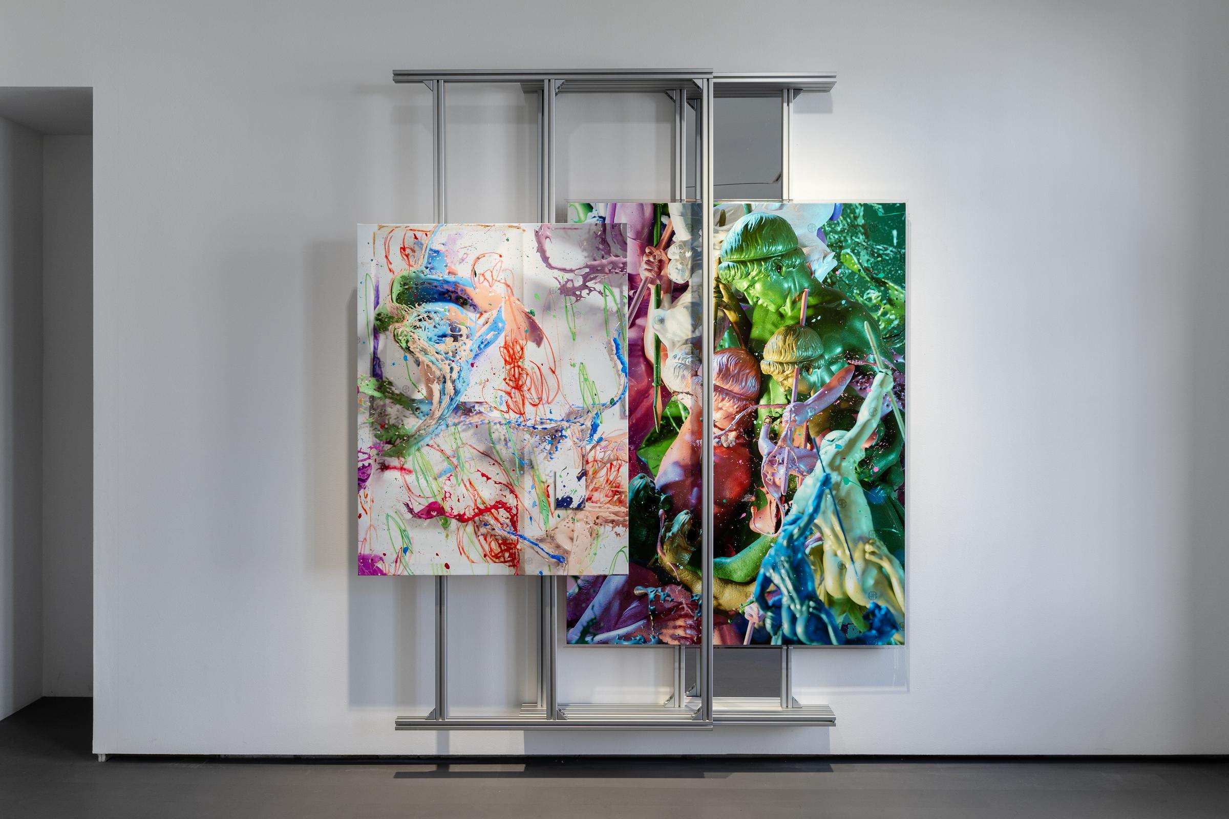 Christian Holze’s installation at Art Rotterdam is a living archive where historical references, digital manipulation, and material transformation converge. Set within a modular aluminum structure reminiscent of museum storage racks, his works actively expose the fluid nature of art history. "Seeing the back of an artwork often tells you as much as the front. It’s about history, context, and the journey of an object."
