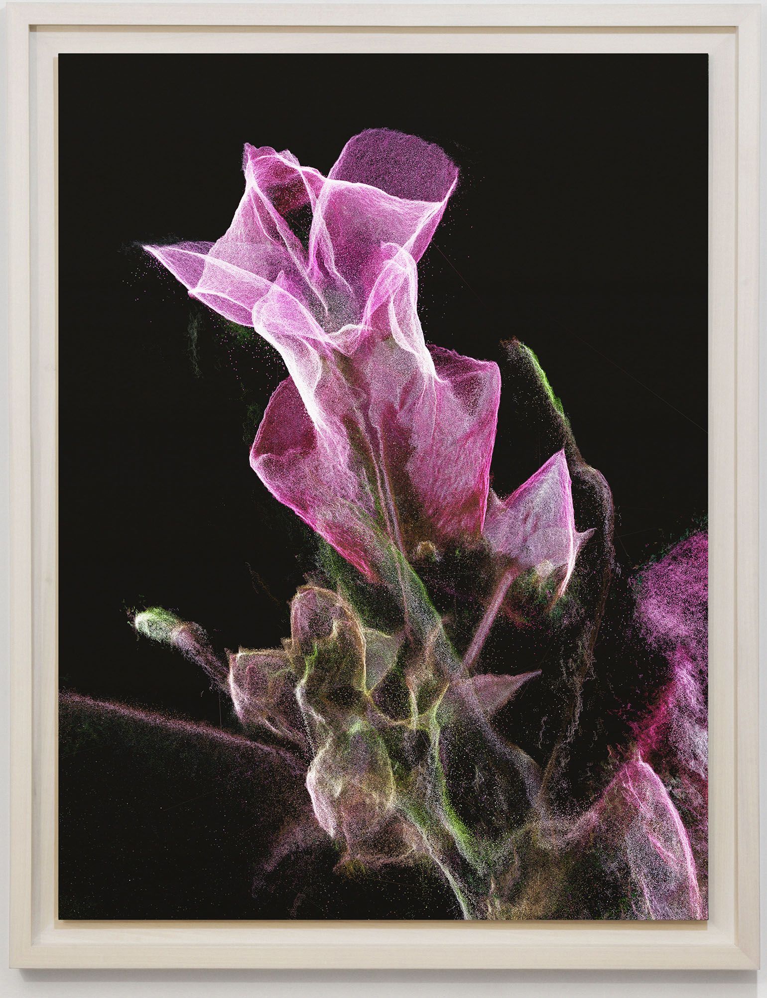 In the series "Phytosynthesis", Stefano Caimi (The Flat – Massimo Carasi) explores how plants and digital technology might meet without losing their essence. Using photogrammetry, flowers are scanned and a custom-built algorithm transforms millions of data points into layered, ethereal images. Caimi does not treat technology as an end in itself but as a material — like clay or paint — that only gains meaning through knowledge and research. His floral compositions balance between visibility and dissolution, revealing the structure of the plant as well as the invisible connections between cells and their surroundings.