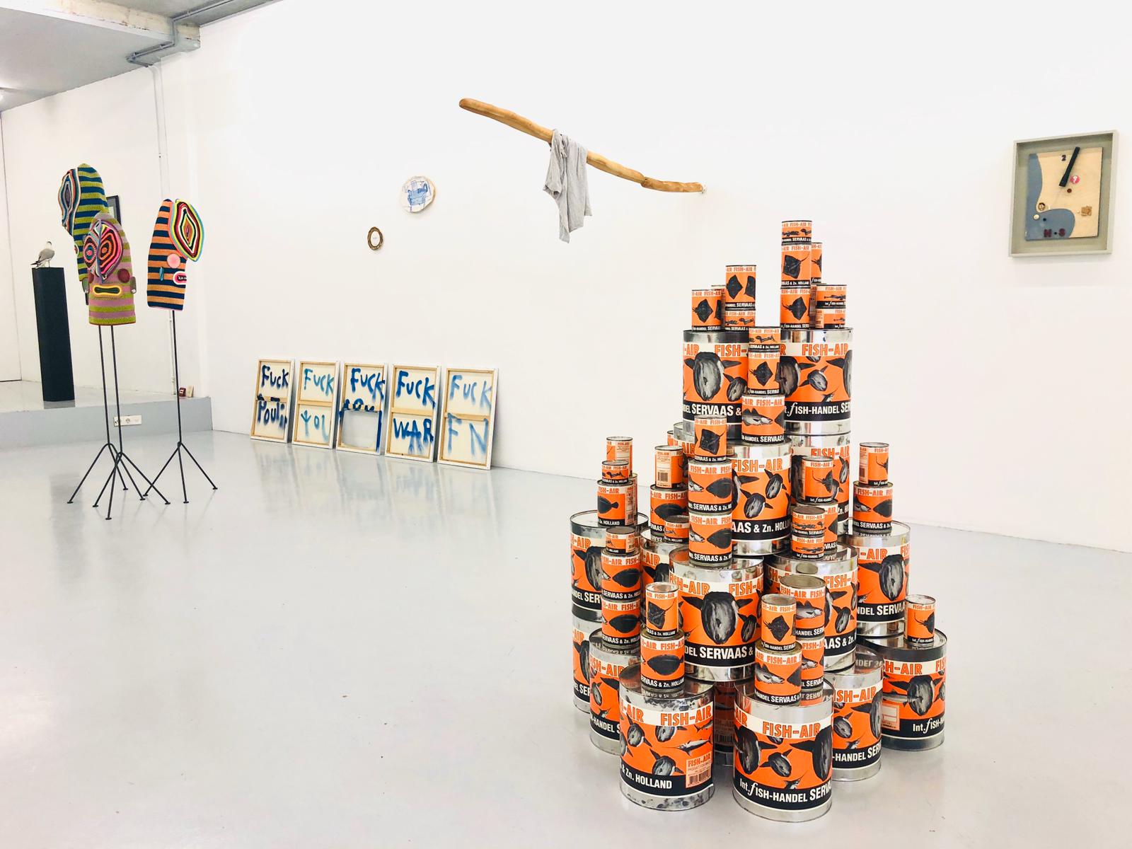 Voor de groepstentoonstelling selecteerde Van Zomeren kunstenaars op grond van een attitude en vond er een aantal bij andere galeries. Die attitude laat zich het best omschrijven als een mix van “plagerig, pop-art-achtig, lichtelijk politiek”. Plagerig en poppie zijn Servaas’ met vislucht gevulde blikken zeker, maar het beste komt die omschrijving naar voren in het sierbord van Koos Buster (Galerie Fons Welters) waarin hij de bekende foto van Thierry Baudet gelegen op zijn vleugel heeft verwerkt. Het bord komt uit de serie: #sierbordenvanbijnaalleswatiknietleukvind