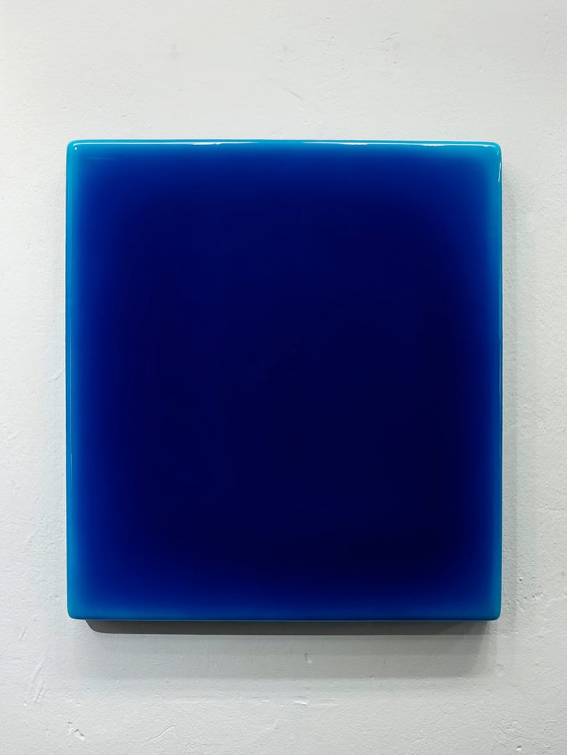 Net als Rothko werkt Dirk Salz (DE, 1962) met talloze lagen waardoor diepte wordt gesuggereerd, alleen zijn Salz’ werken niet opgebouwd uit verf, maar uit epoxy en pigmenten. Salz brengt telkens een laag pigment en epoxy aan, laat deze uitharden en politoert deze vervolgens. Een arbeidsintensief proces dat hij zo’n dertig keer herhaalt. Het resultaat is een glad, spiegelend vlak dat aan de rand lichter blauw is dan in het centrum. “Als je er langer voorstaat, zie je je eigen spiegelbeeld niet meer, maar ervaar je alleen de diepte van het blauw. Het werk heeft een rustgevend effect”, aldus de galeriehouder.