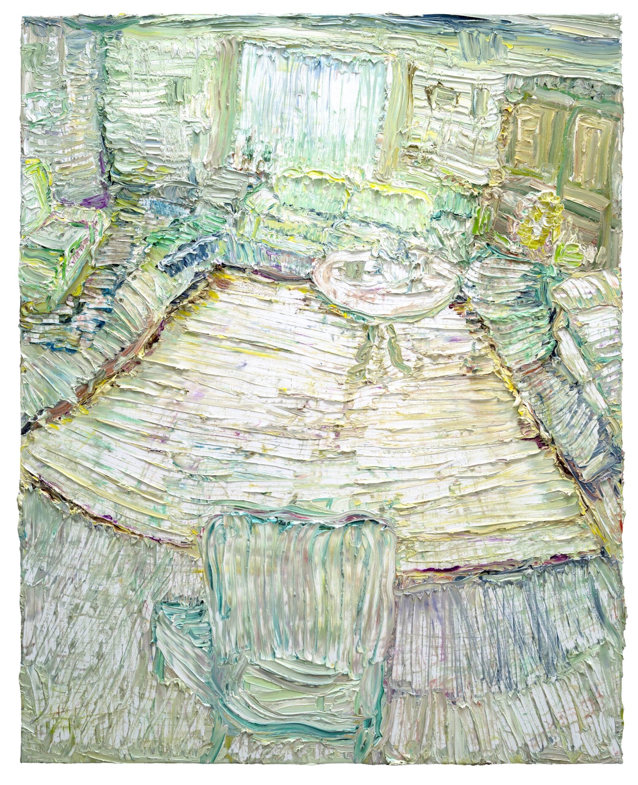 Na verloop van tijd, rond 2017, was dit niet meer bevredigend en wilde ik dat de schilderijen in werkelijkheid ook plastisch werden. Ik begon een doek met een dikke laag witte verf waarop vervolgens de kleur werd aangebracht. Dit was een extra complicerende factor: een dikke laag verse verf is glibberig materiaal en de kleur zakt weg in het romige wit. Als schilder zoek ik een bepaalde weerstand op. Een werk moet niet al te gewillig zijn. De verf kneedt het onderwerp, het onderwerp gaat kopje onder in de verf en komt weer bovendrijven.