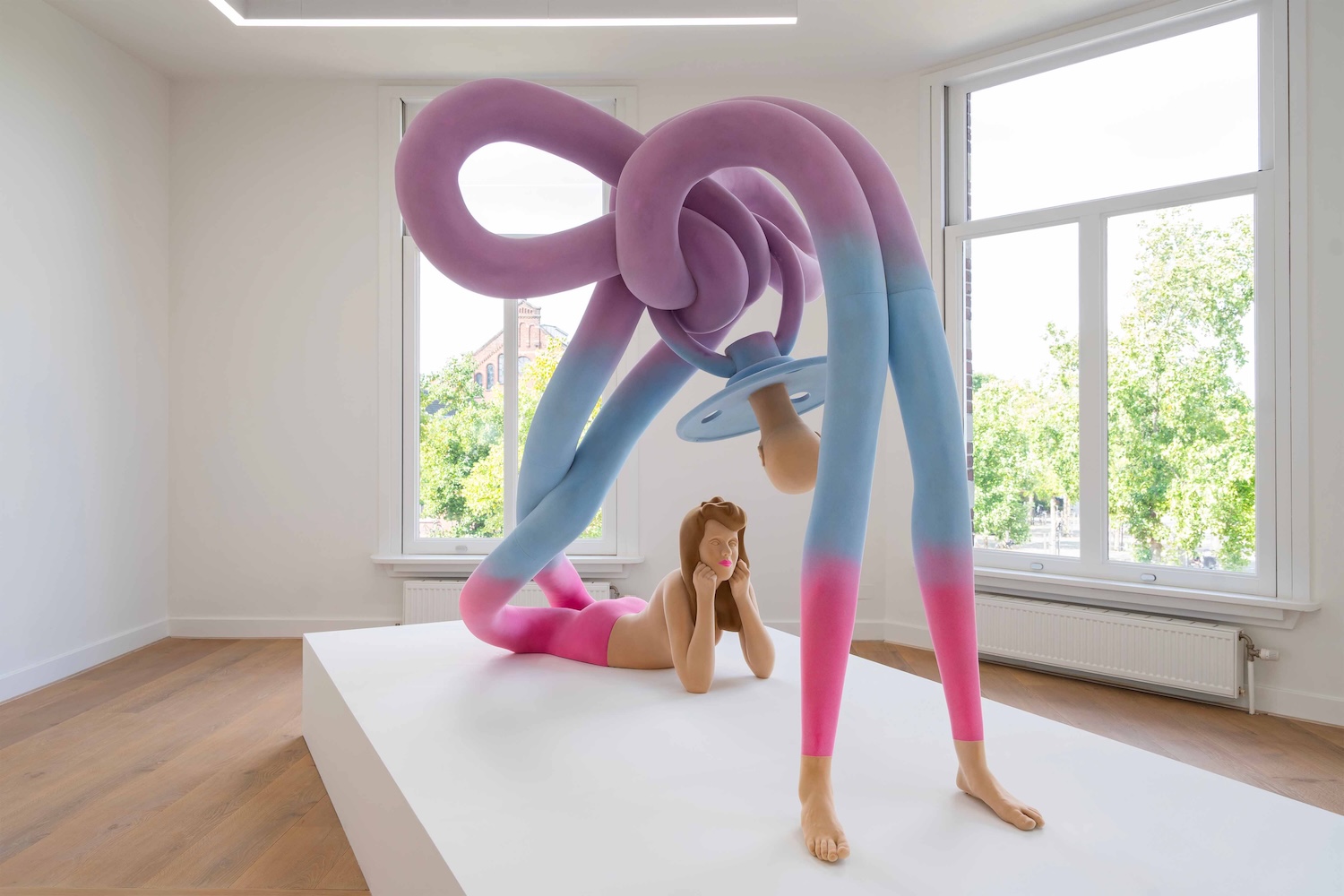 In 'The Mother (The Bobby in Me)' onderzoekt Vera Gulikers (vertegenwoordigd door ROOF-A) het moederschap door te spelen met schaal, vorm en de verwachtingen die aan vrouwen worden gesteld. Haar alter ego ligt op de grond, omringd door twee enorme, in elkaar verstrengelde benen in zachtroze en blauw, als een gigantische stofzuigerslang, met een komisch uitvergrote fopspeen met een babyhoofd. Het geheel krijgt een kinderlijke, bijna absurde lading. Gulikers onderzoekt met kleur, vorm en schaal hoe zorg, vrouwelijkheid en macht zich tot elkaar verhouden.