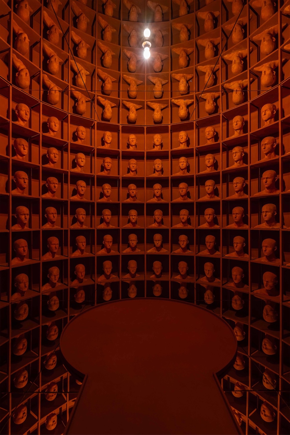 Voor ‘In the depths of memory’ van Levi van Veluw (eveneens vertegenwoordigd door Galerie Ron Mandos) stap je een ronde, terracottakleurige installatie in, gevuld met een raster vol semi-identieke kleien gezichten. Spiegels op het plafond en de vloer geven de installatie een droste-effect, alsof het beeld oneindig doorloopt. Op een videoscherm zie je hoe de kunstenaar telkens zijn eigen hoofd opnieuw boetseert, in een eindeloze cyclus van maken en loslaten. In dit werk onderzoekt Van Veluw de spanning tussen controle en overgave, en de menselijke drang om iets blijvends achter te laten in een wereld die voortdurend verandert.