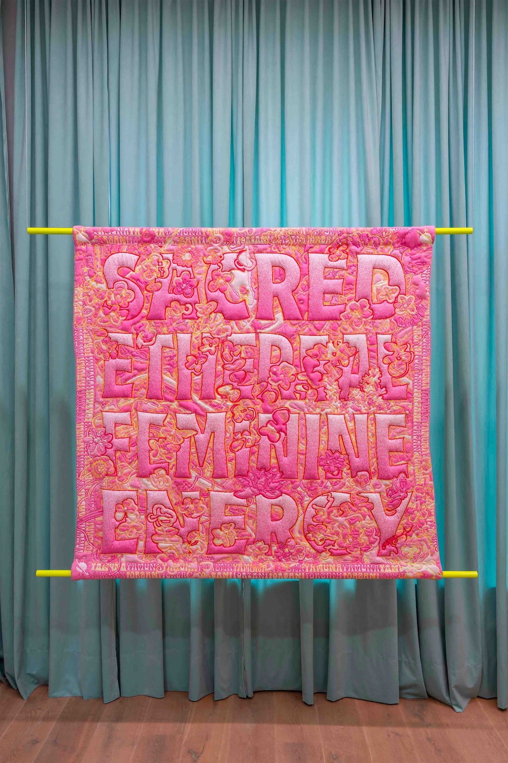 In ‘Sacred Ethereal Feminine Energy’ van Yamuna Forzani (vertegenwoordigd door Rademakers Gallery) combineert de kunstenaar textiel, performance en identiteit in een kleurrijke installatie. Tegen witte muren en blauwe fluwelen gordijnen hangen Jacquard-gebreide wandwerken waarin lichamen, patronen en slogans oplichten in felle tinten roze, rood, geel en blauw. Forzani viert queer levens en nodigt je uit om niet alleen te kijken, maar ook deel te worden van de wereld die ze schept.
