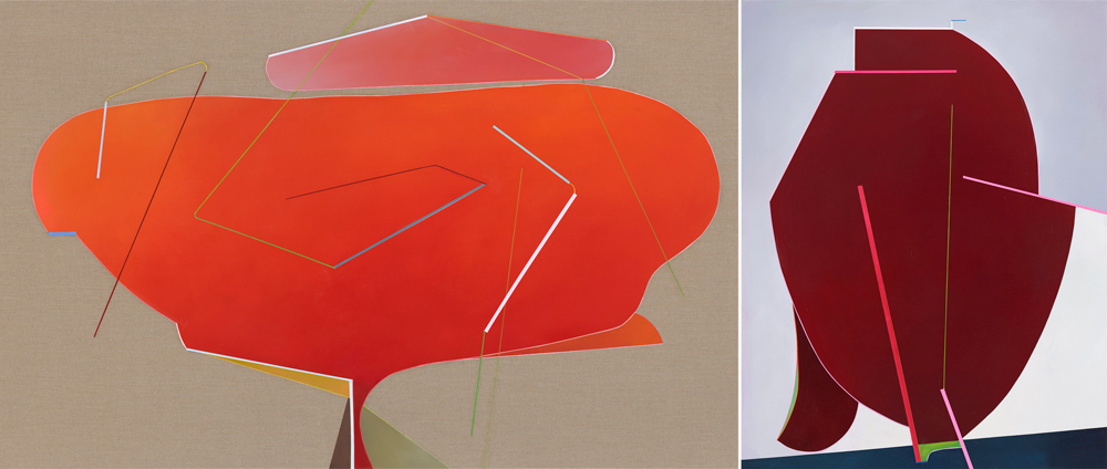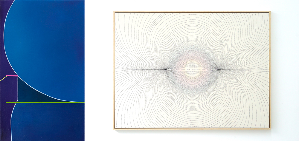 Isabelle, in Unfolding Voids zien we acryl op linnen en geglazuurde keramiek. Kan je toelichten wat de betekenis is van deze twee verschillende lijnen binnen je praktijk?