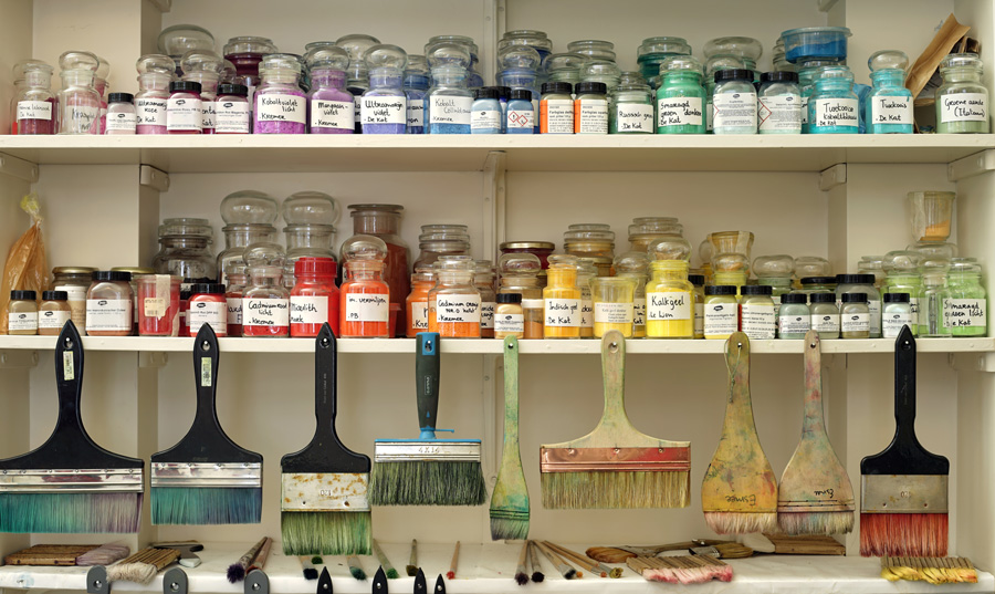 Mijn atelier is in Arnhem-Zuid in een pand waar ook veel andere Arnhemse kunstenaars werken. Mijn atelier is één grote open ruimte met verschillende hoeken die elk een eigen functie hebben, zoals een plek voor het bereiden van mijn verf. Hier staat ook mijn uitgebreide verzameling van pigmenten en bindmiddelen, een muur voor mijn verschillende kwasten, penselen, een kastenwand met alle materialen en gereedschappen en ook een stuk opslag van mijn werk. In het midden staan lange werktafels waar ik op schilder. Aan het plafond hangen sculpturen waar ik nu mee bezig ben.