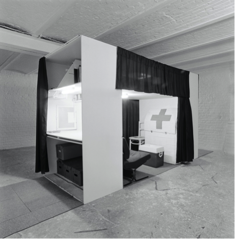 Ik stond nog wel ingeschreven aan de academie maar ik vond het daar te vrij, te anarchistisch, zo van ‘ga je gang maar’ en bij die mentaliteit voelde ik me niet thuis. Toch heb ik die vier jaar uitgezeten. Tijdens die academietijd woonde ik in de Living Box, een oud fabriekje. Daar had ik een constructie gebouwd met twee houten bakken en een plank in het midden en daarboven was mijn bed en de salon die met een gordijntje van elkaar werden gescheiden. Paul Robbrecht (Belgisch architect, red.) doceerde in di tijd Architectuur aan de academie. Op een dag zag hij dat bouwsel waarin ik woonde en hij werd toen zo enthousiast dat hij het direct door een fotograaf heeft laten vastleggen.