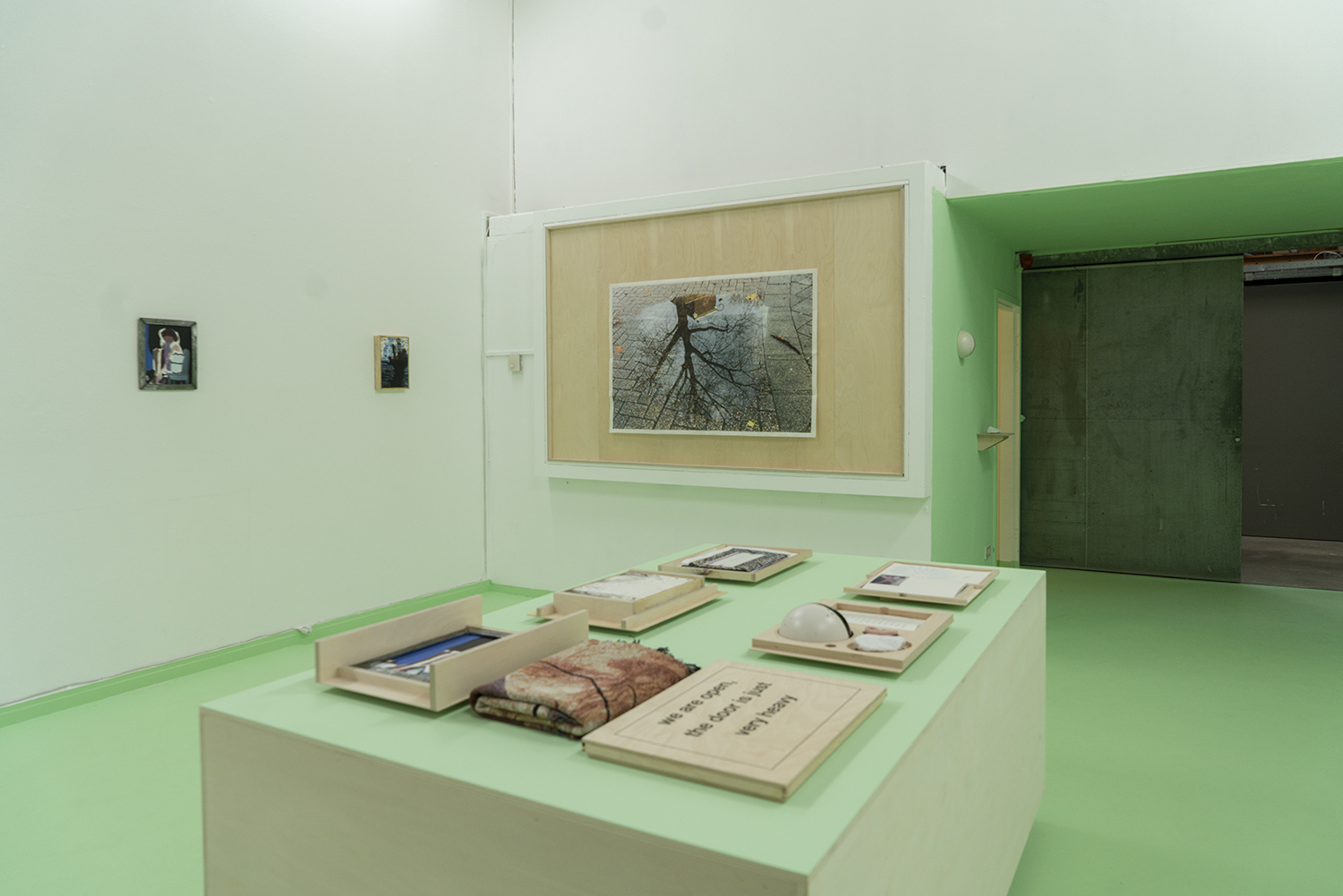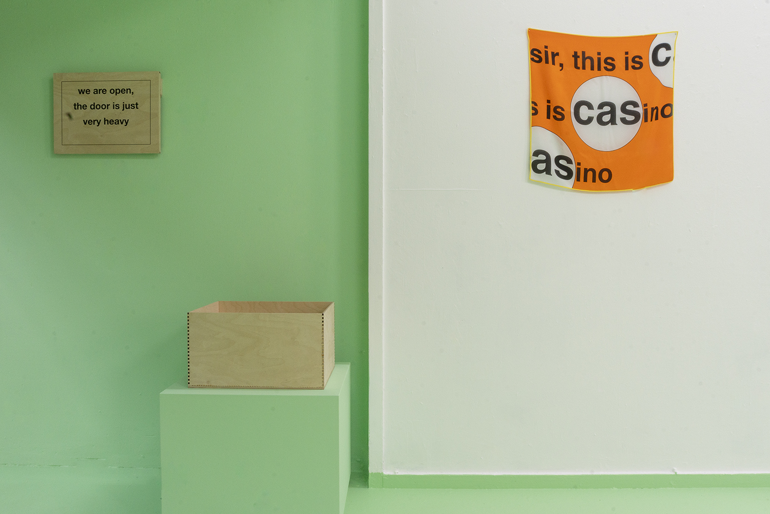The door is open, it is just very heavy, staat in blokletters op het deksel van de doos. Kunstenares Nora Turato (RA 2017-18) trof de tekst aan op de deur van een Amsterdams café. “Eigenlijk past deze tekst beter de Rijksakademie. Wij selecteren maar een keer, aan de poort, en daarna staat de deur open”, zegt Gloudemans.