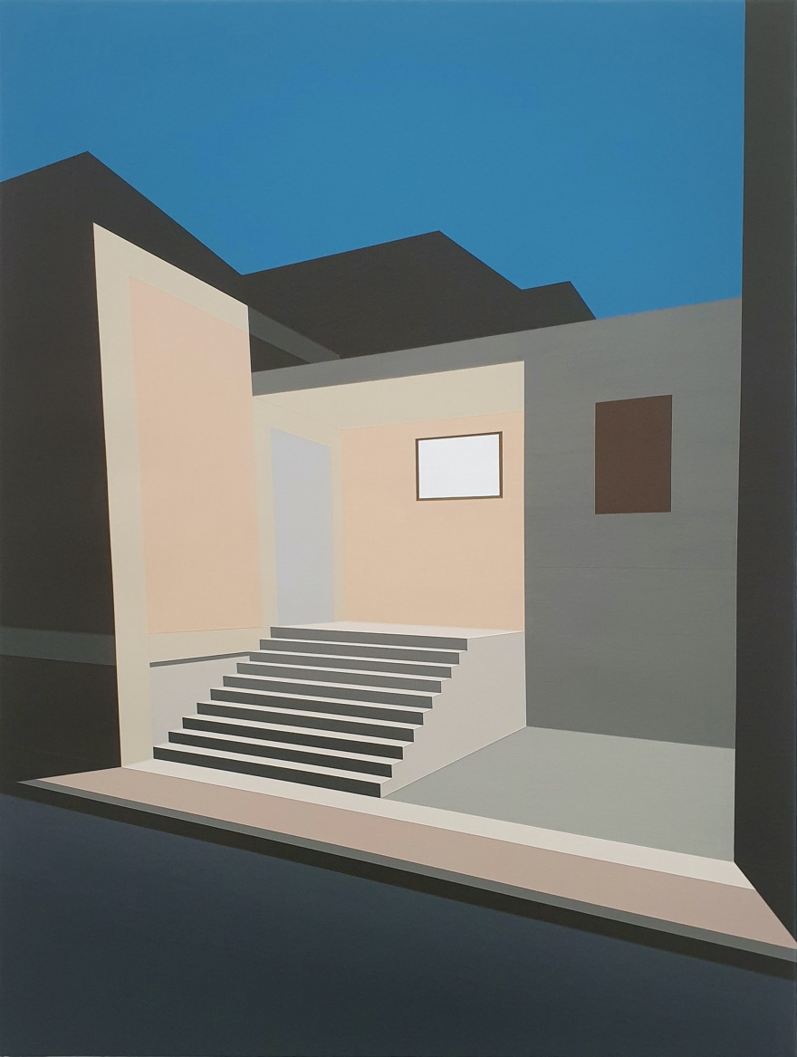 Borzo toont met Reality Pictured het werk van drie generatiegenoten: Jurriaan Molenaar, Ronald Zuurmond en Koen Vermeule. Schilders die elk een andere invulling geven aan de verhouding abstractie en figuratie. Vermeule is een schilder van vluchtige observaties en legt mensen vaak vast in introverte poses tegen een abstracte achtergrond, bijvoorbeeld op een vliegveld of starend op hun telefoon. Jurriaan Molenaar daarentegen schildert abstracte maar fictieve architectuur. Het is voor ons een geluk dat Borzo deze tentoonstelling maakte voordat ze verhuizen van Keizersgracht 516 naar nummer 321 verhuizen, want Molenaars panelen komen geweldig tot hun recht in het modernistische interieur van nummer 516.