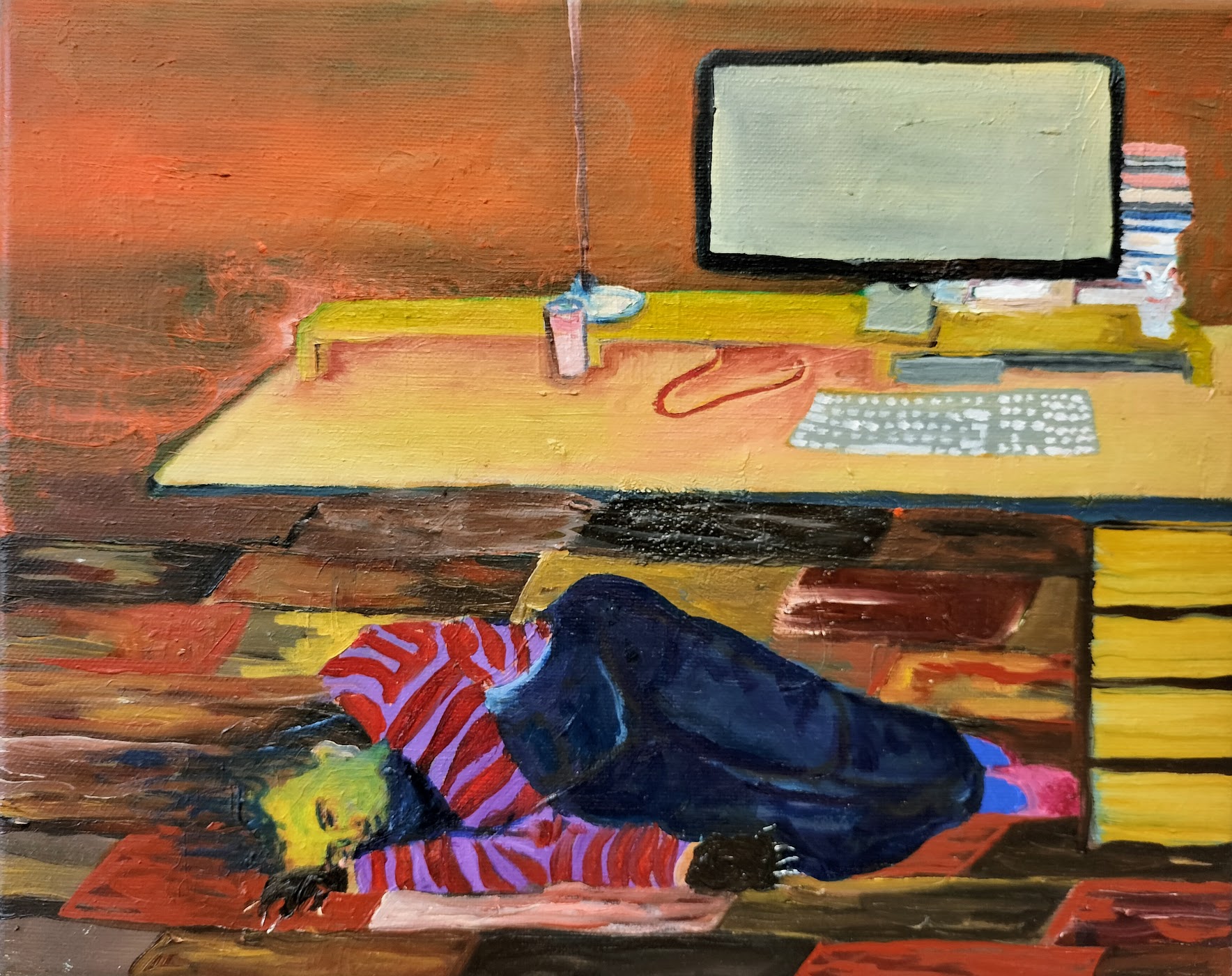 Elke ochtend na het opstaan begon ik mijn dag met een pot koffie op de bank, gehuld in mijn schilderkleren, in het atelier in Berlijn. Terwijl ik mijn werk van de vorige dag bekeek, werkte ik in mijn schetsboek aan oplossingen en ideeën voor de veranderingen die ik wilde aanbrengen. Deze manier van werken verschilde aanzienlijk van mijn routine in Den Haag, waar ik direct op het doek schilderde zonder eerst te schetsen. In Berlijn nam ik de tijd om mijn gedachten eerst in schetsen uit te werken voordat ik ze op het doek bracht, wat resulteerde in meer helderheid in mijn werk.